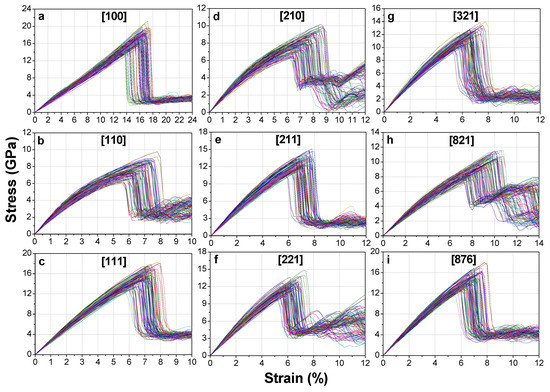 Stress-strain response of the single crystal HEA samples with various element compositions. (a–i) Results of different crystallographic orientations, including [100], [110], [111], [210], [211], [221], [321], [821], and [876]. Each branch figure contains the result of one equiatomic sample and 100 non-equiatomic samples.