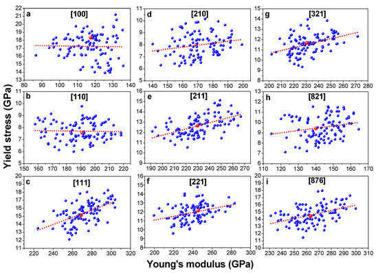 Yield stress as a function of Young’s modulus of the single crystal HEA samples with various element compositions. (a–i) Results of different crystallographic orientations, including [100], [110], [111], [210], [211], [221], [321], [821], and [876]. along different orientations. The red point denotes the result of the equiatomic sample.