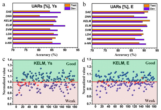 Results of ML models training and evaluation. The results (UARs in [%]) of eight ML models on the task of (a) yield stress, and (b) Young’s modulus. The UARs shown for the dev set are the best UARs achieved by the optimal hyper-parameters tuned for the corresponding model. The UARs shown for the test set are the final performance achieved by the model trained by the train plus dev sets within the optimal hyper-parameters. Prediction result of the 180 non-equiatomic samples on the test set by KELM model for (c) yield stress, and (d) Young’s modulus. The red line is the benchmark line based on the value of the equiatomic sample, the results of non-equiatomic samples are normalised to the benchmark value, where the values above the line are classified to the ‘Good’ zone, and those below the line are classified to the ‘Weak’ zone. If the ML prediction matches the MD simulation, the point is coloured blue, but otherwise the point is coloured red.