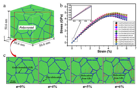 Based on the MD simulation, the results of yield stress and Young’s modulus are classified into two groups. Meanwhile, the prediction results (‘Good’ or ‘Weak’) are given by the ML model. The comparison results of MD simulation and ML prediction are listed in Table 2. For yield stress, it was found that the ML model can give a correct prediction on nine tested samples, with only P4 for an exception. The accuracy is consistent with the prediction of single-crystal samples (~90%). However, the ML model failed to predict Young’s modulus of four (P2, P5, P9, and P10) out of the ten tested samples; the predictive accuracy is much lower than that in the case of the single crystal. This deviation is mainly attributed to the grain boundaries in the polycrystal sample. Experiments and simulations have proved that the existence of grain boundaries has an important effect on the mechanical properties of materials [45,46,47,48]. As mentioned, the yield stress depends mainly on the nucleation of the first set of dislocations [24]. The stress required for dislocation nucleation at grain boundary is much lower than that required for nucleation of the single-crystal sample with defect-free structure [35,49], so the yield stress of polycrystal samples shows an overall decreasing trend when compared with single-crystal samples. In addition, similar to the single-crystal sample, dislocation nucleation is still the main reason for polycrystal samples to yield under the current grain size. Taking Cu28Fe13Ni23Cr8Co28 as an example, Figure 7c shows the configuration of the sample at different deformation stages under tension. These snapshots are the cross-sectional view of the sample along [110] direction. It can be seen that the yielding of the sample occurs at tensile strain between 4~5%, which corresponds to the initial dislocation nucleation at the grain boundaries. After that, the system stress decreases rapidly with higher density of dislocations nucleated from grain boundaries. Meanwhile, it is shown that the configuration of the grain boundary network has not changed substantially near the yielding point, indicating that the presence of grain boundaries does not play an important role in the yield process of the polycrystal sample for the current grain size, and thus has almost no impact on the prediction accuracy of ML on the yield stress task.