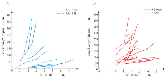 Fatigue crack growth curves of (a) X2-12 and (b) X2-9 in reference and precharged conditions, tested at a stress ratio of R = −1, f = 1 Hz, and a stress amplitude of 365 MPa (X2-12), 430 MPa (X2-9 H2), and 460 MPa (X2-9 ref) [4] (reproduced from [4], MDPI, 2018).