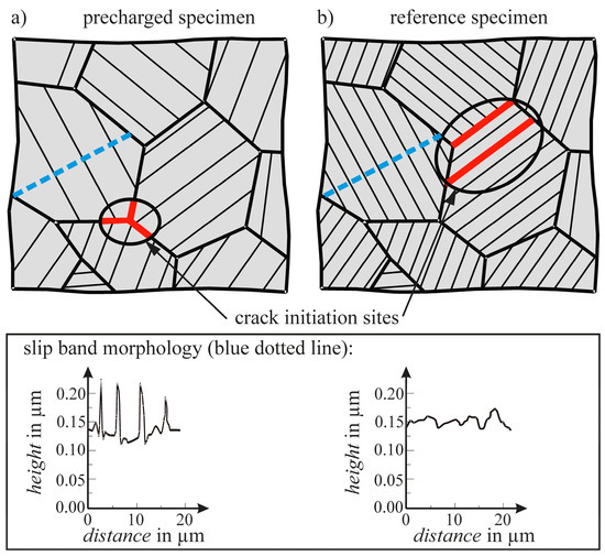 Schematic representation of crack initiation location and slip band morphology in (a) precharged and (b) reference specimen of X2-12 [4] (reproduced from [4], MDPI, 2018).