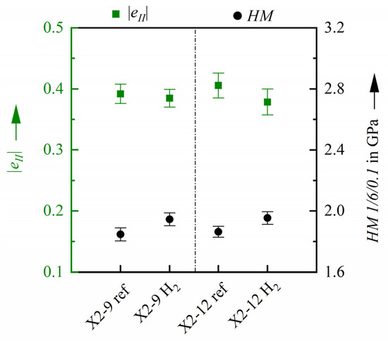 In Figure 6, the values of eII and HM, which were obtained in cyclic microindentation tests performed at Fmax = 1000 mN, are shown for X2-9 and X2-12. Despite the significant differences in austenite stability and chemical composition, both materials show comparable values of HM and eII. As expected, the hardness of precharged specimens is increased for both materials, which was also observed with the Berkovich indenter and Fmax = 5 mN. Furthermore, a significantly lower cyclic hardening potential of the precharged specimens is shown for the X2-12 steel (see Figure 6). For the X2-9 variant, a trend towards lower cyclic hardening potential can also be observed for the precharged specimens, which is however, significantly less pronounced in comparison to the X2-12 steel. Note that eII and HM represent mechanical properties at different length scales. While HM is dominated by macroplastic deformation processes, eII is a result of microplasticity at a significantly smaller length scale.