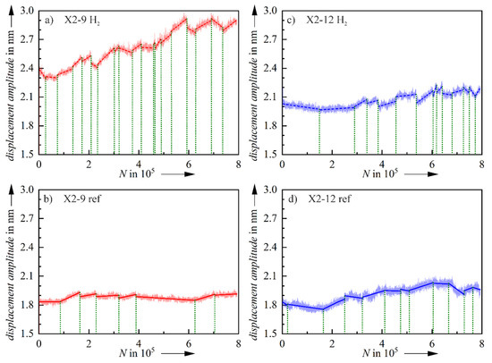 In the nanoindentation fatigue tests only the displacement amplitude was determined, which is shown exemplarily in Figure 7. Comparing the reference and precharged specimens, a trend towards a higher level of displacement amplitude can be observed for precharged variants of both materials, caused by a more pronounced plastic deformation beneath the indenter.