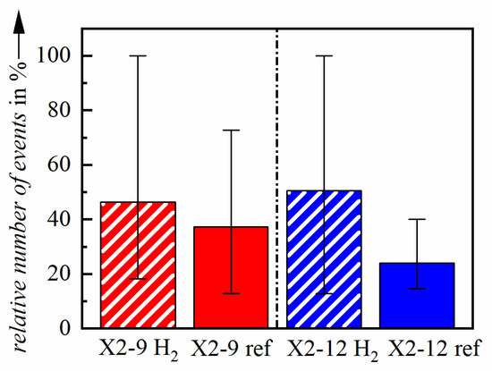 Comparing the number of events in the course of the displacement amplitude, represented by the green dotted lines in Figure 7 and defined as abrupt changes in displacement amplitude, significant differences can be observed. The precharged specimens show significantly more events, which represent more pronounced plastic deformation [41]. In Figure 8, for each steel the number of events is given in relation to the maximum number of events measured in precharged conditions. Note that a high scatter was observed in these experiments, leading to a relatively high standard deviation (see Figure 8). However, the mean values indicate that the precharged specimens exhibit a significantly higher number of events than the reference variants. As the events are assumed to be caused by the movement of dislocations, this indicates a greater local plastic deformation of hydrogen precharged specimens.