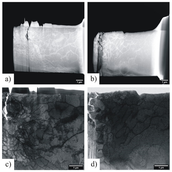 TEM results of X2-12: (a) And (b) are overview STEM images showing the position of the crack tip for (a) the reference and (b) the precharged condition; (c) and (d) are corresponding TEM bright-field images at higher magnification documenting dislocation cells.