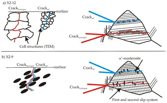 Schematic representation of the formation of different dislocation cell structures and crack propagation paths in reference specimens (red) and hydrogen precharged samples (blue) of (a) X2-12 and (b) X2-9.