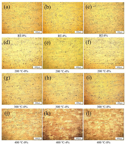 Metallographic structure of 2A12-T4 aluminum alloy under the thermal strain condition. (a) Room temperature untreated, E.g. base material; (b) 4% pre-strain was given at room temperature; (c) 8% pre-strain was given at room temperature; (d) Without strain under peak temperature of 200 °C; (e) 4% pre-strain was given at peak temperature of 200 °C; (f) 8% pre-strain was given at peak temperature of 200 °C; (g) Without strain under peak temperature of 300 °C; (h) 4% pre-strain was given at peak temperature of 300 °C; (i) 8% pre-strain was given at peak temperature of 300 °C; (j) Without strain under peak temperature of 400 °C; (k) 4% pre-strain was given at peak temperature of 400 °C; (l) 8% pre-strain was given at peak temperature of 400 °C.