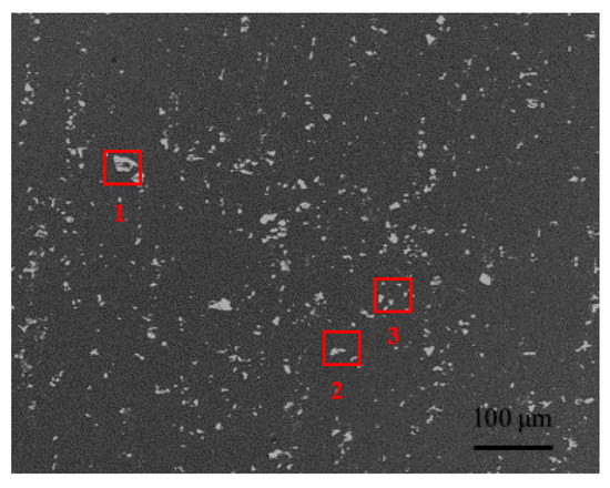The cross-section morphology of the precipitated phase of 2A12-T4 aluminum alloy is diffusely distributed, and has three kinds of morphologies. As shown in Figure 3, “1” is a large flake, “2” is a short rod, and “3” is fine granular. The energy spectrum (EDS) analysis was carried out for the precipitated phase of the above three morphologies. The results are shown in Table 3, where w/% represents the mass fraction of the element, and x/% represents the atomic fraction of the element. The main elements in the particles of the precipitated phase are Al and Cu. According to a review of relevant literature review [17,18], the components of the precipitated phase are mainly θ (Al2Cu) and S (Al2CuMg).