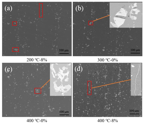 With the increase of peak temperature, the morphology and distribution state of the precipitated phase were also in different degrees, as shown in Figure 4. When the peak temperature was 200 °C, the morphology of the precipitated phase did not change significantly. As shown in Figure 4a, there were still three morphologies, namely, fine grain shape, short rod shape, and large flake shape. However, under the action of tensile strain, the distribution trend of the precipitated phase along the tensile direction was more obvious. When the peak temperature was 300 °C, the number of the precipitated phase was significantly reduced. This is due to the fact that, at a high temperature, some dispersed granular precipitated phase may dissolve into the matrix, and the new phase cannot be precipitated due to the short residence time at high temperature, as shown in Figure 4b. When the peak temperature was 400 °C, due to the rapid increase in heat, recrystallization occurred, which increased the number and the density of precipitated phase increased. However, part of the large size of the precipitated phases showed a trend of disintegrating along the stress direction, as shown in Figure 4c, further proving that the dispersed fine precipitated phase dissolved into the matrix at a high temperature. In Figure 4d, as the strain degree increased, the elongated filamentous precipitated phase appeared, and the number of the precipitated phase increased and aggregated. Then, the precipitated phase was distributed along the stretching direction. In summary, under the condition of 8% strain, a significant plastic deformation and dislocation multiplication occur in the aluminum alloy, which provide a particle for the precipitation of the precipitated phase in the cooling process.