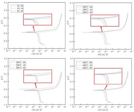 Figure 6 shows the potentiodynamic polarization curve of the 2A12-T4 aluminum alloy in a 3.5% NaCl solution under different thermal strain coupling conditions. It can be seen that the polarization curves measured under all the parameters showed anodic dissolution without obvious passivation characteristics.
