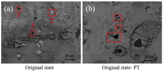 Figure 7b shows the corrosion morphology after the corrosion time is prolonged (expressed by “PT”). As there was no precipitated phase around the corrosion pits of “1” above, the potential difference is not big. In addition, the corrosion rate of the matrix near the corrosion pit slowed down, while the precipitated phase in the corrosion morphologies of “2” and “3” began to peel further, resulting in the deterioration of the corrosion degree of the matrix. Therefore, in the case of sufficient corrosion time, the precipitated phase with a small size played a role in slowing down the corrosion of the matrix, while the precipitated phase with a large size aggravated the corrosion of the matrix.
