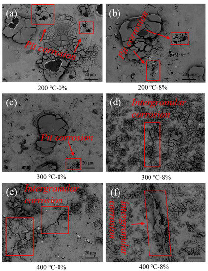 SEM figures of corrosion morphology. (a) Without strain under peak temperature of 200 °C; (b) 8% pre-strain was given at peak temperature of 200 °C; (c) Without strain under peak temperature of 300 °C; (d) 8% pre-strain was given at peak temperature of 300 °C; (e) Without strain under peak temperature of 400 °C; (f) 8% pre-strain was given at peak temperature of 400 °C.