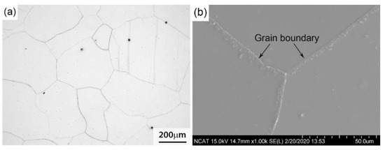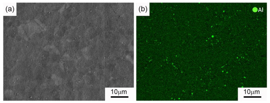 Figure 2 shows the starting Mg-6Al alloy plate after homogenization. As shown in the optical micrograph in Figure 2a, the alloy was fully homogenized and the grain boundaries were clearly visible. The grain size determined by the linear interception method was in the range of 300~400 μm. Figure 2b shows the corresponding SEM micrograph. It is clearly seen that the second phase was almost dissolved into the Mg matrix, leaving only limited sporadic bright particles distributed along the grain boundaries. Figure 3 shows an EDS mapping of the alloy, and the calculated chemical composition is listed in Table 1, which shows that the weight percentage of the Al element in the selected area is 6.14 wt.%, which is close to the nominal composition (6 wt.%).