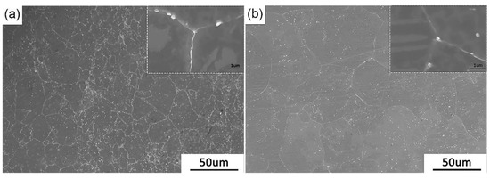 SEM images of the Mg-6Al plate (a) as-rolled and (b) annealed at 300 °C. Corresponding high-magnification images are shown in the insets.
