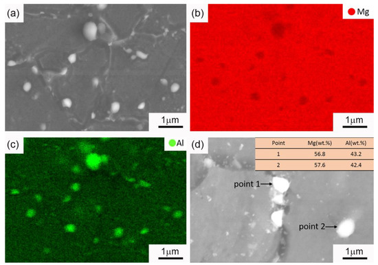 Figure 4 presents SEM images of the as-rolled plate and that which annealed at 300 °C. As can be seen, numerous spherical second-phase particles with a size smaller than 0.5 μm were observed at the grain boundaries and inside grains. It is worth noting that after annealing at 300 °C (Figure 4b), the second-phase particles still exist. The reason for this may be that it takes at least approximately 40 h to achieve the complete dissolution of the second phase due to the low diffusion rate of Al atoms in the Mg matrix for Mg-Al alloys [32]. In this study, annealing at 300 °C for 15 min was not sufficient for full dissolution of the Al atoms in the Mg matrix. EDS analysis was used to identify the second-phase precipitates, as seen in Figure 5a. According to the Mg and Al elemental maps (Figure 5b,c, respectively), the second-phase precipitates (<1 μm) consisted of high concentrations of Al. The corresponding EDS point analysis results (Figure 5d) reveal that the composition of the second phase is very close to the weight fraction of Mg17Al12, so the second phase could be considered the Mg17Al12 intermetallic phase according to the Mg-Al phase diagram [33].