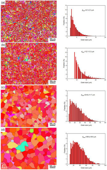 Figure 6 shows the EBSD inverse pole figure (IPF) maps on the ND plane of the as-rolled and annealed plates. The different colors represent different orientations of the grains. The near-identically colored grains indicate that the mismatch in orientation between these grains is insignificant. Firstly, the microstructure of the as-rolled plate (Figure 6a) was greatly refined compared to that in the homogenized state (Figure 2a), indicating the occurrence of dynamic recrystallization (DRX). Beer et al. [34] and Samman et al. [35] reported that dislocations accumulate near grain boundaries and rearrange through cross-slip and climb during hot deformation processing, which then form into low-angle grain boundaries. In turn, these low-angle grain boundaries can be further transformed into high-angle grain boundaries by continuously absorbing new dislocations, which then form into new DRXed grains. Secondly, as seen in Figure 6b, annealing of the as-rolled plate resulted in equiaxial grains, indicating that homogeneous nucleation and grain growth occurred during static recrystallization (SRX). Especially for the plates annealed at 275 (Figure 6c) and 300 °C (Figure 6d), there was remarkable grain growth. The grain size distributions of the as-rolled and annealed plates obtained from post-EBSD analysis are also shown as histograms adjacent to the micrographs. The average grain size of the as-rolled plate was 9.1 μm, while for the plates annealed at 250, 275, and 300 °C, average grain sizes of 12.1, 24.8, and 36.6 μm were observed, respectively.