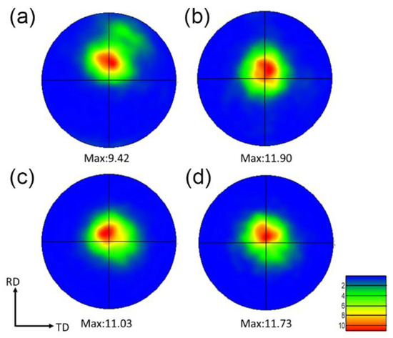 {0001} pole figures of the plates: (a) as-rolled, with the same plate annealed: (b) 250 °C, (c) 275 °C, and (d) 300 °C for a fixed time of 15 min.