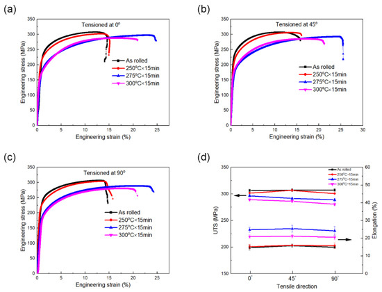 In-plane engineering stress-strain curves of the as-rolled plate and annealed plates in the tensile directions of (a) 0°, (b) 45°, and (c) 90° relative to the RD, and (d) the trends of the ultimate strength and elongation to failure in the three directions.