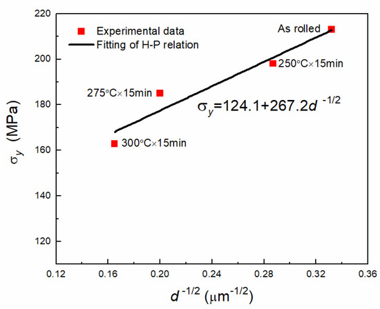 Figure 9 shows the Hall–Petch relationship for the as-rolled and annealed plates, with ky = 267 MPa m1/2 and σ0 = 124.1 MPa, which is very close to the reported 127.0 MPa of annealed ZK60 alloy sheets processed by warm rolling [22]. It can be seen that the relationship between σy and d was in good agreement with the Hall–Petch relationship. Comparing the grain sizes of the as-rolled and annealed plates at 250 °C in Figure 3, the average grain sizes were about 9.1 and 12.1 μm, respectively, so the YS of the plate annealed at 250 °C decreased slightly to 199.1 from 213.1 MPa in the as-rolled one. Increasing the annealing temperature to 275 and 300 °C led to a significant increase in grain sizes, which were about 24.8 and 36.6 μm, leading to a large decrease in their YS values, which were 195.0 and 162.9 MPa, respectively.
