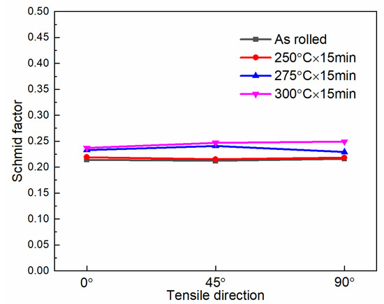 where τCRSS is the critical resolved shear stress (CRSS), is the stress applied on the material, and is the Schmid Factor, which can be expressed as = cosα × cosβ, where α is the angle between the slip direction and the axis of the external force and β is the angle between the slip plane and the axis of the external force. It is known that for the tensile specimens, the value of m was in the range of 0~0.5. The basal slip system (0001) {110}would be easily activated under a situation where m has a higher value, which induces a lower YS and higher elongation [47]. The Schmid Factor values of the basal slip system in three directions for the as-rolled and annealed plates were calculated and are shown in Figure 10. It can be seen that there was not much difference in the m values between the as-rolled and annealed plates at 250 °C, while the m values for the plates annealed at 275 and 300 °C evidently increased. However, the grain sizes of the plate annealed at 300 °C (36.6 μm) were much larger than those annealed at 275 °C (24.8 μm). Therefore, combining all factors, the plate annealed at 275 °C achieved the best overall mechanical properties.