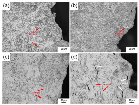 Figure 11 shows optical micrographs of the microstructures near the fracture surface of the post-tensile tested specimens (tensioned along RD) from the as-rolled and annealed plates. The fracture surfaces were first partially polished to reveal in better detail the morphology of the grain interiors. A high density of twins can be observed in all specimens (as indicated by red arrows). Note the many micro-cracks in the specimen from the plate annealed at 300 °C. In addition, in Figure 4, no coarse second phase particles (>1 μm) were observed in the as-rolled and annealed plates, so no crack initiation could have occurred near second phase precipitates in the tested specimens. Therefore, the fracture mechanism of the plates is anticipated to be more closely related to the material’s twinning behavior during the tension process.