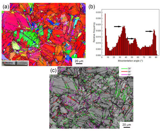 As such, in order to determine the type of twins present, the subsurface morphology of the grains near necking area of a specimen (tensioned along RD) from the plate annealed at 300 °C was further analyzed by EBSD, as shown in Figure 12a. The misorientation angle distribution shows three different peaks (as indicated by the black arrows in Figure 12b). To further reveal the twin types, the grain boundaries are marked by different colors (Figure 12c). According to the misorientation relationships between the twins and the matrix [48], the twin types can be effectively identified. Specifically, the misorientation angles of 38°, 56°, and 86° represent {101}–{102} double twinning, {101} compression twinning, and {102} tension twining, respectively. In this case, all three different kinds of twins were observed (see Figure 12c). In rolled and annealed plates with typically strong basal textures, the {101} compression and the {101}−{102} double twins can easily form because the c-axes of most grains are all perpendicular to the axis of the tensile stress [49,50]. (Note that the tensile specimens were all in the plane of the DSR plates.) As expected, the stress-strain profiles of the samples lack the characteristic sigmoidal shape associated with deformation twinning and, instead, are indicative of a slip-based deformation behavior. Therefore, coupled with an exhausted work-hardening capacity, the occurrence and formation of these twins must occur at the late stages of the deformation process. In turn, this leads to the onset of shear failure due to the combined effects of strain softening and localized twin-sized void formation. Since the CRSS for twinning decreases with increasing grain size [51], twinning becomes easier in the coarser grained materials. Indeed, the samples annealed at higher temperatures (larger grain sizes) had higher numbers of twins. Due to the incompatibilities between the deformation of the twinned interface and the matrix, the continued increase in local stresses is prone to induce micro-cracks. It was thus expected that a larger number of micro-cracks would be observed in the plate annealed at 300 °C, wherein there was correspondingly less fracture elongation.