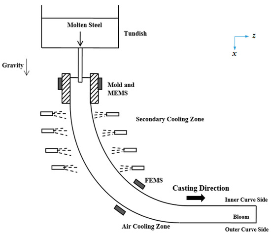 - Huang, J.T.; He, J.C. Numerical simulation of steel solidification and electromagnetic brake in the billet mold. Acta Metall. Sin. 2001, 37, 281–286. [Google Scholar]