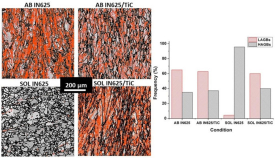 The fraction of low angle grain boundaries (LAGBs ϴ ≤ 10°) and high angle grain boundaries (HAGBs ϴ > 10°) were estimated by EBSD analysis, as reported in Figure 3. The IN625 and IN625/TiC presented a similar quantity of LAGBs (around 65–63%) and HAGBs (about 35–37%). After the solution annealing treatment, the complete recrystallization and grain growth of the IN625 material developed a frequency of HAGBs of 95.6%, thus almost eliminating all the LAGBs. On the other hand, the IN625/TiC composites only exhibited a slight increment of HAGBs, with a frequency of 40%, coupled to a limited reduction of LAGBs, reaching a frequency of 60%. Therefore, it is evident that the TiC particles provided a significant obstacle to altering the grain structures. In another study, it was reported that the use of TiC particles with 40 nm had the effect of increasing the LAGBs with respect to the alloy in the AB state [25]. This was caused by the high number of subgrain structures induced by the nano-TiC particles. On the contrary, in this work, considering the micro-TiC size, no significant impact seems visible in the AB condition. Only after applying the solution annealing treatment, the key role of the micro-TiC reinforcement in maintaining the original grain structures was highlighted.