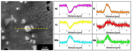 In order to further analyze the formed MC carbides, an EDS scan line at higher magnification was performed (Figure 6). In this way, it was possible to detect a higher concentration of Nb, Mo, Ti, and C correlated with the depletion of Ni and Cr with respect to the gamma austenitic matrix, thus lending support to the formation of MC carbides [38,39,40]. As mentioned before, the formation of MC carbides is compatible with the thermal exposures at 1150 °C [17,38].