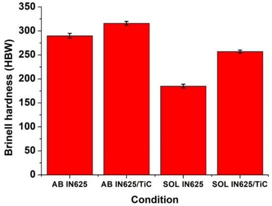 Figure 9 reports the trend of the Brinell hardness for the alloy and composite built using the same process parameters. In the AB condition, the composite presented slightly higher hardness than the alloy. This can be correlated with the addition of the hardening TiC particles.
