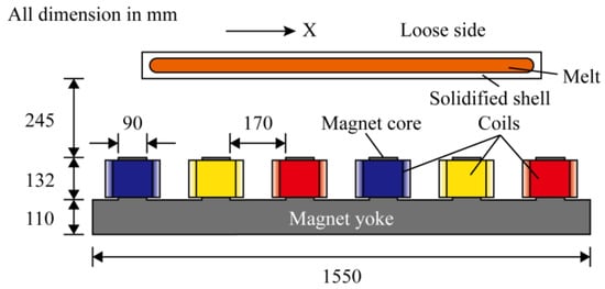 The physical model of the single-ruler EMBr in the current work was the same as the conventional model in [], which is also applied in a real thin slab caster. The top edge of the EMBr magnet was immediately below the bottom end of the SEN. Each magnet was 150 mm away from the midsection of the wide face. A schematic diagram of the SEMS system in the top view is shown in Figure 2. The system was placed at the fixed side of the strand. A three-phase alternating current with a 120° phase angle was supplied to the coil windings. All the magnet cores were 400 mm high in the casting direction; details are given in Table 1.