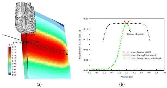 (a) Contour plot of the exterior magnetic field arising from the EMBr in one quarter of the mold. The x-, y-, and z-axis were along the direction of the width, thickness, and height of the mold, respectively. The origin had the same height as the pole center of the EMBr magnet. (b) Field strength in the three lines. The negative direction of the z-axis was the same as the casting direction.