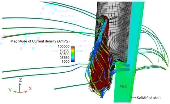 The exterior magnetic field remained constant. Therefore, the braking force was determined by the induced current density, as expressed by Equation (15). Induced current density lines from a nozzle jet are shown in Figure 5, in which the jet is a velocity isosurface of 0.65 m/s. The main closure of the current loops passed through the isosurface. However, under insulated wall conditions, loops would occur in a large volume in the mold if nonconducting walls were assumed, which was discussed by Miao []. Two conditions of fully insulated walls and perfectly conductive walls were also discussed in []. An extreme braking effect was observed with perfectly conductive walls, and strong instabilities were developed under fully insulated walls. Both conditions would exist in a real continuous casting process. In this work, a solidified shell with low electrical resistance was considered, although the wide and narrow faces were assumed to be insulated. As shown in half of the midsection of the narrow face in Figure 5, the current density in the solidified shell was higher than that in the adjacent melt. This is a more reasonable current distribution of a real casting process in theory. In addition, the streamlines changed direction frequently, like waves on the nozzle jets. This was a result of the unbalanced flow from the nozzle ports.
