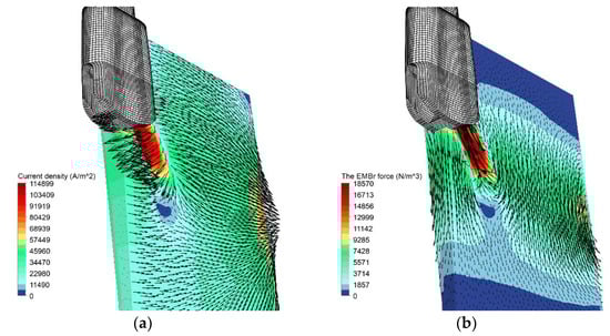 where is the electric conductivity of solid steel. When the equation of electric potential was solved, the induced current density could be obtained. Then, the Lorenz force and Joule heat caused by the induced current density could be calculated in the same form as Equations (13) and (14). The difference is that the electric conductivity here is related to the liquid fraction of steel.