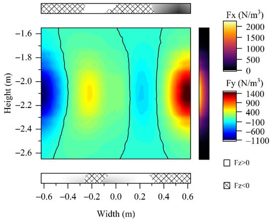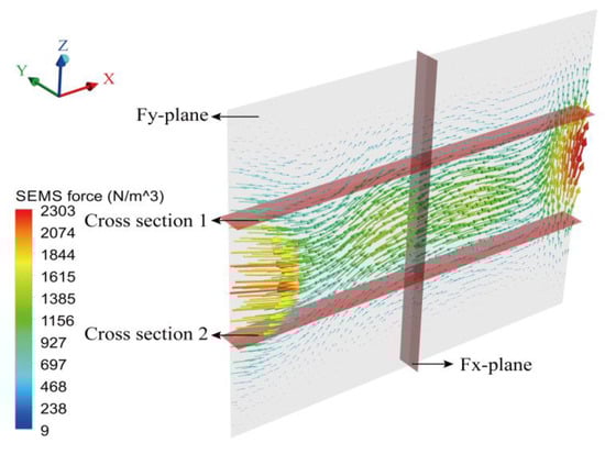 The time-averaged electromagnetic stirring force arising from SEMS is shown in Figure 7. Four planes were selected for a normal stirring force analysis. Cross-section 1 and cross-section 2 were the upper and lower edges of the SEMS magnet. The center height of the strand in Figure 7 was the same as that of the magnet. It appeared that most of the force was distributed between the two cross-sections. The maximum force appeared at the narrow face, which can also be seen in Figure 8. The force fluctuated in the x-axis direction (width direction of the strand). The stirring force in the normal direction to the four planes is given in Figure 8. In the Fy-plane, the stirring force in the thickness direction was divided into four zones by the three black lines; two were negative and two were positive. In the Fx-plane, the stirring force in the width direction was positive toward the positive direction of the x-axis (Figure 7). The main part was distributed in the iron core area. The directions of the normal stirring force in the two cross-sections were opposite. The magnitudes of the normal force in the two cross-sections are not shown here, as they were much smaller than those of the other two directions.