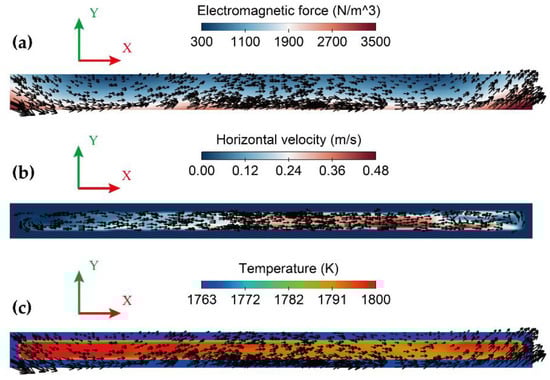 Simulation results in the strand at the mid-height of the SEMS: (a) the magnitude and direction of the time-averaged electromagnetic stirring force; (b) the magnitude and direction of the horizontal velocity; and (c) the temperature distribution. The vector arrow in (c) is the electromagnetic stirring force.