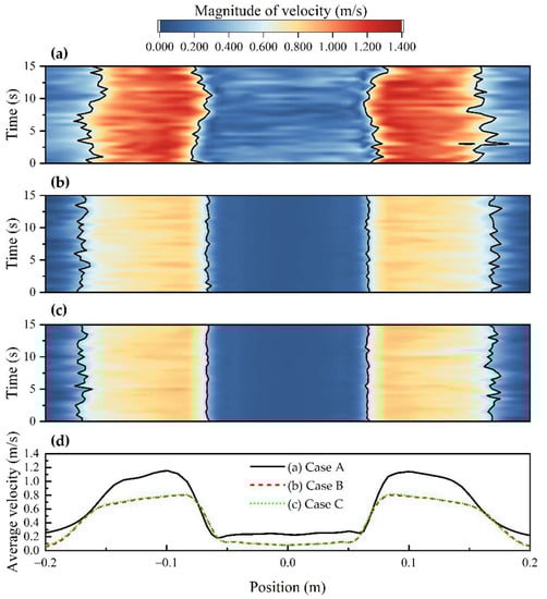 The effect of the EMBr on the nozzle jet was analyzed in three ways. First, the suppressive effect on the intensity of the nozzle jet was investigated. As seen in Figure 11a–c, the spatiotemporal velocity on the yellow line (Figure 9b) was plotted. A unified magnitude range of 0–1.4 m/s was used for an intuitionistic comparison. The maximum velocities monitored in Cases A (Figure 9a), B (Figure 9b), and C (Figure 9c) were 1.153, 0.805, and 0.817 m/s, respectively. It could be concluded from the color distribution and the maximum velocity magnitude that the intensity of the nozzle jet was obviously suppressed after applying the EMBr.