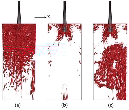 Isosurfaces of the Q-criterion (1 s−2): (a) Case A; (b) Case B; (c) Case C.