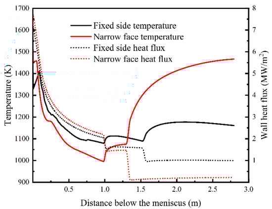 The temperature and heat flux curves on the centerlines of wide and narrow faces are shown in Figure 13. All narrow faces discussed in this section are in the positive direction of the x-axis in this work. The maximum heat fluxes were near the meniscus and were 7.23 and 7.76 MW/m2, respectively. The curves were nearly straight out of the mold, as air-mist nozzles and guiding rolls were not distinguished in the current work. The surface temperature decreased gradually in the mold; then, a sudden rise could be seen out of the mold outlet. The temperature trend of the fixed side was similar to the measured or predicted results in the slab continuous casting process [,]. A distinct result was observed on the narrow face. The temperature there increased faster than that on the fixed side because only natural convection and radiation heat transfer occurred.