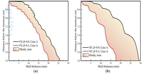 The growth of the solidified shell was mainly influenced by the heat removed from the strand surface. When the EMBr and SEMS were not applied, the mushy zone and solidified shell on the central section of the wide (Figure 14a) and narrow (Figure 14b) faces are given. The curve of the liquid fraction equal to 0.1 was regarded as a completely solidified shell, and the curve of the liquid fraction equal to 0.9 was regarded as the solidification front. The mushy zone on the narrow face was thicker, especially beyond the mold outlet. This indicated that the temperature gradient of the narrow face was lower, which can also be inferred from the heat flux in Figure 13.