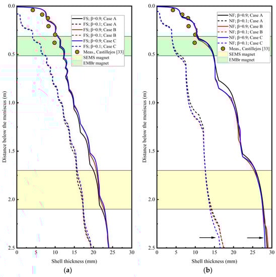 The solidified shell and solidification front fluctuated. The solidified shell thicknesses of the three cases and a model validation are given in Figure 15. The solidified shell thickness compares with Castillejos’s measurements in []. The measurements were carried out on a thin steel slab resulting from a break-out. No electromagnetic fields were applied, and the casting speed was 4.3 m/min. The predicted data for both the wide (Figure 15a) and narrow (Figure 15b) faces were compared with the measurements, because detailed measurement locations in the cross-section of the slab resulting from a break-out were not mentioned in the reference. Although the experimental measurements were not performed directly with the same settings in the current work, these measurements were valuable and reliable for an indirect validation of thin slab continuous casting processes []. As can be seen in Figure 15, good agreement was achieved with the solidification front (β = 0.9), as parts of the melt in the mushy zone may have solidified after the break-out. The experimental points also fluctuated, and a remelting phenomenon can be inferred from its trend. In the initial stage of solidification, the experimental thickness increased quickly, i.e., the solidification rate is faster. All these results can be predicted by the current model. Consequently, the present model is reliable, and the results above are important for revealing the sophisticated phenomena in CSP casters.