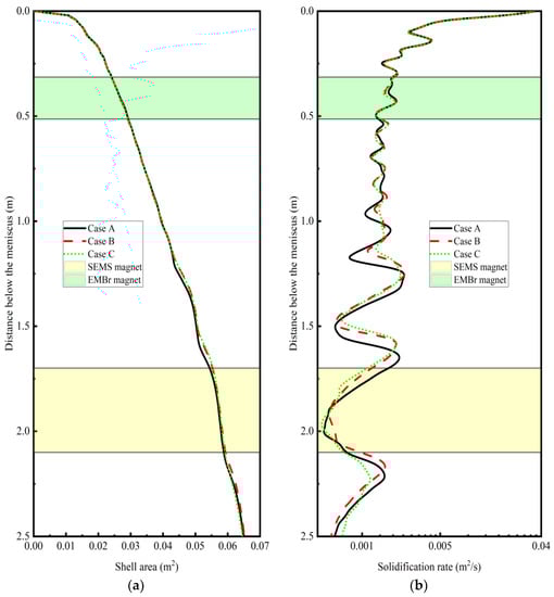 The total area of the solidified shell below the meniscus is profiled in Figure 16a. The distribution curves were quite flat compared with that of the shell thickness in Figure 15. A more uniform trend could be seen after the application of an electromagnetic field, although the difference was imperceptible before the mold outlet (1.0 m below the meniscus). The solidification rate of the solidified area is given in Figure 16b. In the initial stage of solidification, the solidification rate was quite fast, almost 40 times that of the secondary cooling zone. It could be inferred that the microstructure of the outer surface might be well-developed columnar crystals. The curve of the solidification rate with electromagnetic control was flatter than that without electromagnetic control. When SEMS was applied (Case C), the solidification rate became flatter, especially beyond the SEMS zone. It was conceivable that the stirred melt in the secondary zone slowed the speed of the solidification front. A more balanced and uniform shell was formed. This trend might also be beneficial to a uniform microstructure [,,]. It could be referred that appropriate turbulence in the secondary zone was beneficial to the internal quality of steel, as shown in Figure 12.