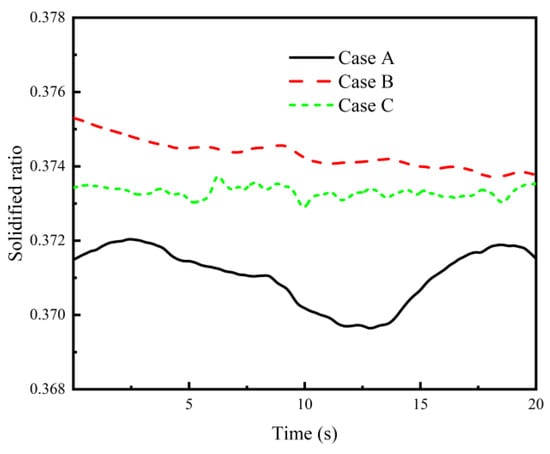The solidified ratio of the mold outlet is shown in Figure 17. A visible characteristic is that the solidified shell was more stable under EMBr application. One reason was that the braking force of the EMBr on the nozzle jet could weaken the speed and intensity of the jet to the shell. This can also be seen in Figure 16b, in which the solidification rate curve becomes flatter near the mold outlet (1.0 m below the meniscus). The flow field in the mold was more stable, and more energy input was distributed to the secondary cooling zone. Thus, the solidified shell thickness at the mold outlet increased when the EMBr was applied. As a whole, the energy distribution tended to be uniform. The effect of the SEMS could be inferred from flow field characteristics. When the liquid melt rushed to the narrow face, one stream flowed back to the mold. A part of the energy was transported into the mold. Therefore, the solidified ratio of the mold outlet was lower than that without the EMBr. It is logical that the average solidified ratio in Case A was the minimum, with an average value of 0.371, and the average ratios in Cases B and C were 0.374 and 0.373, respectively.