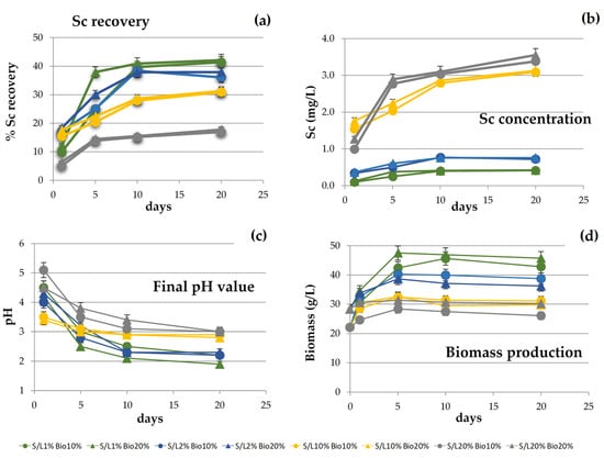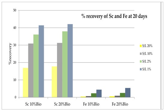 Taking into consideration the preliminary tests, the effect of the S/L ratio, as well as the biomass dosage, were thoroughly investigated and monitored for up to 20 days, since a longer duration had no significant effect. The solutions of 1 and 2% S/L ratios exhibited the best Sc percentage recovery, increasing up to 42 and 38%, respectively, in agreement with other studies that reported higher recoveries at low S/L ratios [22,28]. Qu et al. [22] reported a higher recovery of Sc of 52% under a one-step process at a 2% S/L ratio using an Acetobacter sp. isolated from RM; this is, therefore, probably a more suitable microorganism for the bioleaching of BR.