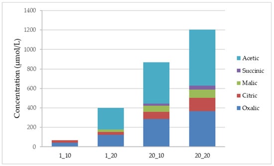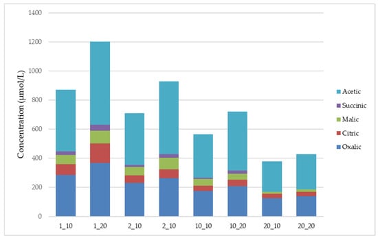A solution of 1% pulp density of BR with 20% w/w bacterium suspension resulted in the highest organic acid production, with acetic acid equal to 572.5 μmol/L being the main acid, as was expected from an Acetobacter strain, followed by oxalic (367.4 μmol/L), citric (134.3 μmol/L), malic (85.9 μmol/L), and succinic (42.0 μmol/L) (Figure 4). This agrees with the highest recovery of Sc that was recorded with the same conditions. The increase in organic acid concentration in experiments with 1% pulp density during the period of bioleaching is shown in Figure 4. The total organic acid concentration from 1 d to 20 d was increased three times.