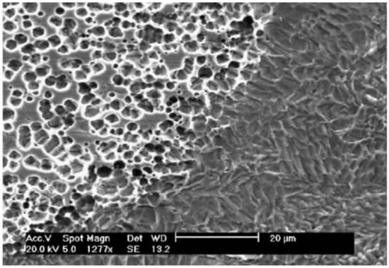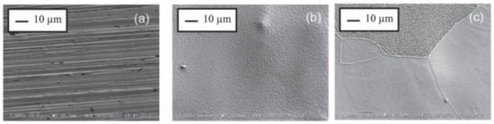 The behavior of various samples of the mechanically abraded stainless steels (410, 302, 304, 316, and 347) as disc working electrodes was studied under anodization in ethaline []. It was established that no changes in the surface composition of the samples were observed after the electrochemical polishing, and no dealloying of the steels was detected. The SEM image of the sample of stainless steel 304 (Figure 2) showed that a grain boundary pattern typical for the stainless steel samples disappeared in the untreated region after anodization. It was shown also that breakdown of the oxide film was the rate-limiting factor in electropolishing. The desired optically bright finishing of the samples was achieved by electropolishing of the above stainless steels, which seemed to depend on the performance of the oxide film removal, and was observed only for stainless steel 410.