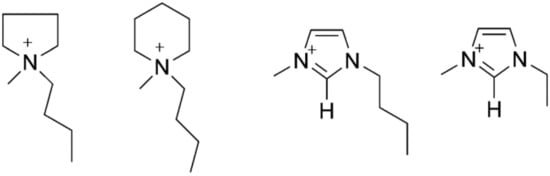 Ionic liquids based on organic cations such as imidazolium, pyridinium, and so on (Figure 3) also exhibit high efficiency in electrochemical polishing of some metals and alloys [,,]. Counterions are usually presented by inorganic anions such as BF4−, PF6−, N(SO2CF3)2−, Cl−, and so on [,].