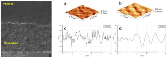 SEM (left) and AFM (right) images of Ti samples before electropolishing (a,c) and after electropolishing (b,d) (reprinted with permission from ref. []; Copyright 2020 by the author(s), published by the Electrochemical Society of Japan).