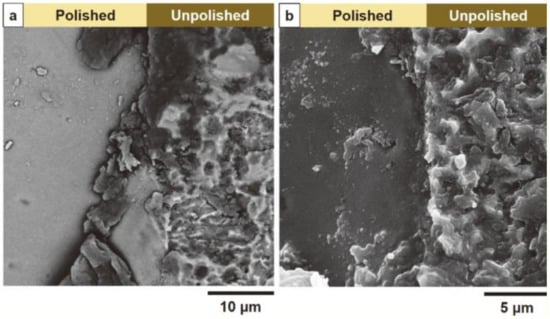 SEM image of the unpolished stainless steel 304 region (left) and SEM image of stainless steel 304 (right), showing transition between polished (top) and unpolished (bottom) regions of the sample after electrochemical polishing in a choline chloride–ethylene glycol mixture (reprinted with permission from ref. []; Copyright 2006 The Owner Societies).